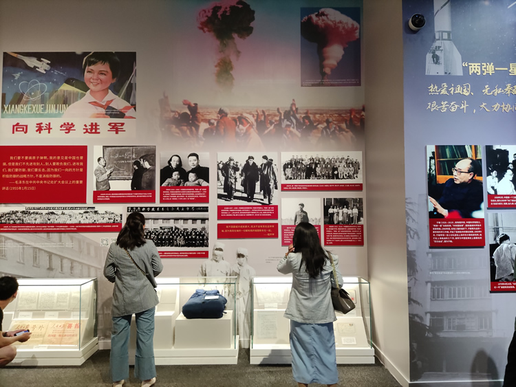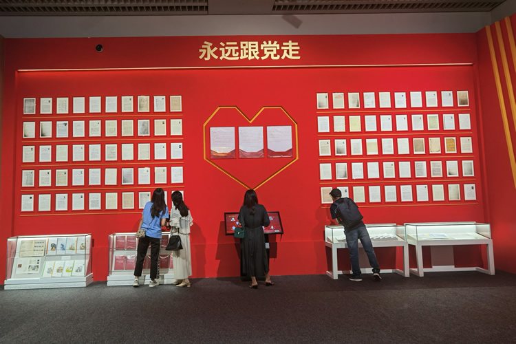 “永遠(yuǎn)跟黨走”一面紅墻最頂部寫著五個(gè)亮眼的大字,紅墻之上陳列滿了百位科學(xué)家的入黨申請(qǐng)書。泛黃的紙張上,科學(xué)家們工整優(yōu)美的字跡,真誠質(zhì)樸的心聲,包含著他們?yōu)辄h為國的一片赤誠。