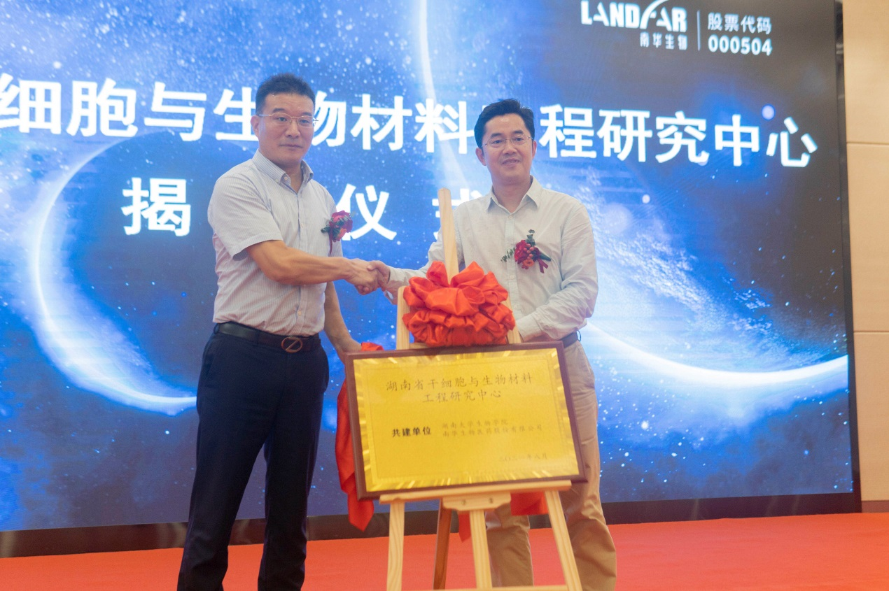 南華生物總經(jīng)理游昌喬(左)與湖南大學(xué)教授、岳麓學(xué)者聶和民(右)共同為湖南大學(xué)與南華生物共建的湖南省干細胞與生物材料工程研究中心揭牌。