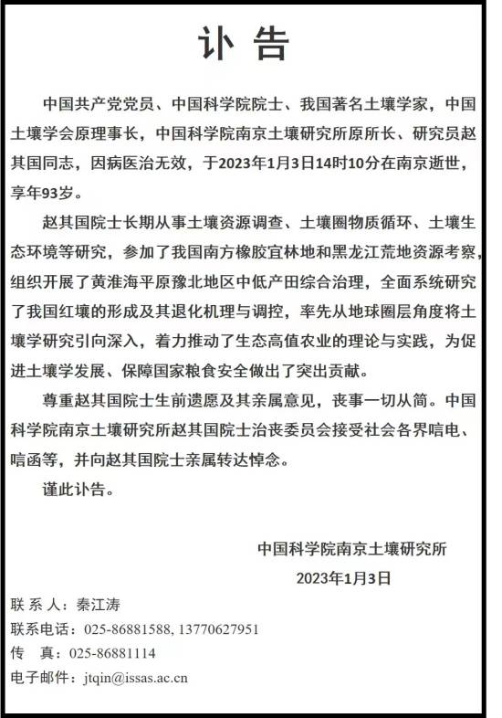 前幾日還與趙其國院士交流工作,今日本刊忽驚聞噩耗。中國科學(xué)院南京土壤研究所發(fā)布訃告:中國共產(chǎn)黨黨員、中國科學(xué)院院士、我國著名土壤學(xué)家,中國土壤學(xué)會原理事長,中國科學(xué)院南京土壤研究所原所長、研究員趙其國同志,因病醫(yī)治無效,于2023年1月3日14時10分在南京逝世,享年93歲。