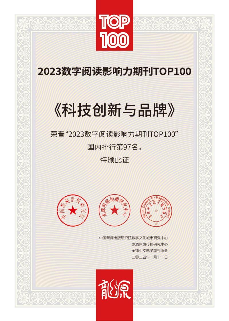 2024年1月11日,2023年數(shù)字閱讀影響力期刊TOP100榜單通過線上元宇宙會議的形式發(fā)布,《科技創(chuàng)新與品牌》連續(xù)第6年進(jìn)入TOP100榜單,榮登2023數(shù)字影響力期刊TOP100國內(nèi)排行第97名。再次彰顯了本刊作為專注于報(bào)道科技人才成就、聚焦科技創(chuàng)新成果、宣傳培育品牌范例的國家級綜合期刊的強(qiáng)大影響力、傳播力以及讀者極高的認(rèn)可度。