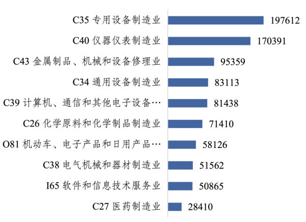 在專利申請方面,近三年,全國高校專利總量超過167萬件,其中高校50強專利總量超過65萬件,占比約39%。在高校50強中,72%的高校近三年申請專利數(shù)量超過5000件,34%的高校專利申請量高于8000件,10%的高校專利申請量和授權(quán)量分別超過10000件和7000件。就行業(yè)分布而言,針對專用設(shè)備制造業(yè)領(lǐng)域的專利數(shù)量最多,其次是儀器儀表制造業(yè),金屬制品、機械和設(shè)備修理業(yè)以及通用設(shè)備制造業(yè)。