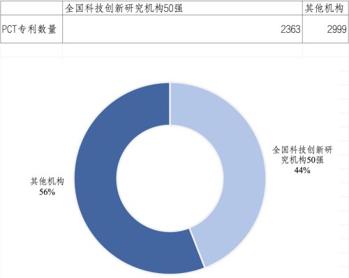 研究機構(gòu)作為科技創(chuàng)新與成果轉(zhuǎn)化的中樞節(jié)點,在創(chuàng)新方面與高校有諸多相似之處。例如,在“全國科技創(chuàng)新研究機構(gòu)50強”中,東部地區(qū)數(shù)量依然最多,近三年P(guān)CT國際專利申請聚集度仍相對較高,且針對制造業(yè)領(lǐng)域的技術(shù)創(chuàng)新占比較大。不同點在于,近三年研究機構(gòu)的專利數(shù)量并不多,在研究機構(gòu)50強中,只有8%的專利申請量超過3000件。