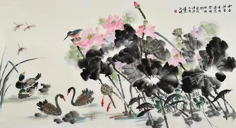 劉寶堆荷花美術(shù)作品《和合共生 有朋遠來》95x180