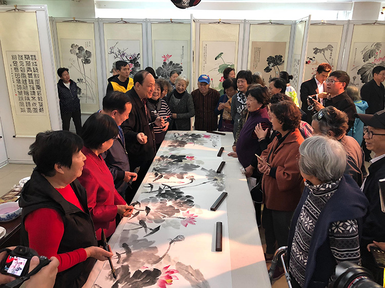 在北京的展覽現(xiàn)場劉寶堆義務(wù)為北京世紀(jì)新景園社區(qū)畫荷弘和班講課