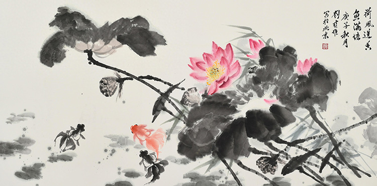 劉寶堆國畫荷花作品《荷風(fēng)送香魚滿堂》55x95