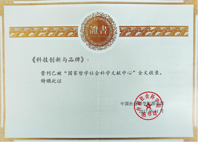 “國(guó)家社會(huì)科學(xué)文獻(xiàn)中心”全文收錄《科技創(chuàng)新與品牌》證書