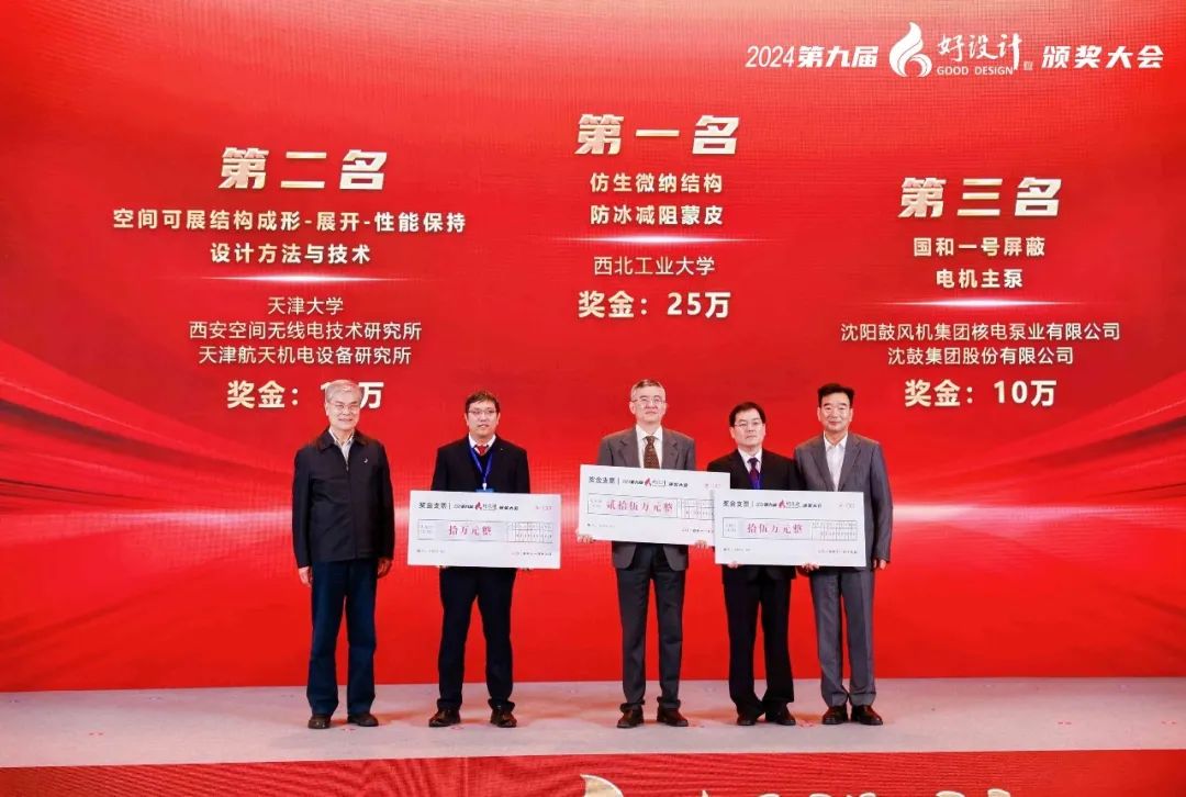 潘云鶴院士與浙江雙環(huán)傳動(dòng)機(jī)械股份有限公司董事長(zhǎng)吳長(zhǎng)鴻先生共同為2024“好設(shè)計(jì)”獎(jiǎng)前三名的項(xiàng)目頒發(fā)獎(jiǎng)金。仿生微納結(jié)構(gòu)防冰減阻蒙皮、空間可展結(jié)構(gòu)成形-展開-性能保持設(shè)計(jì)方法與技術(shù)、國(guó)和一號(hào)屏蔽電機(jī)主泵三個(gè)項(xiàng)目分別獲得25萬、15萬和10萬元獎(jiǎng)金。