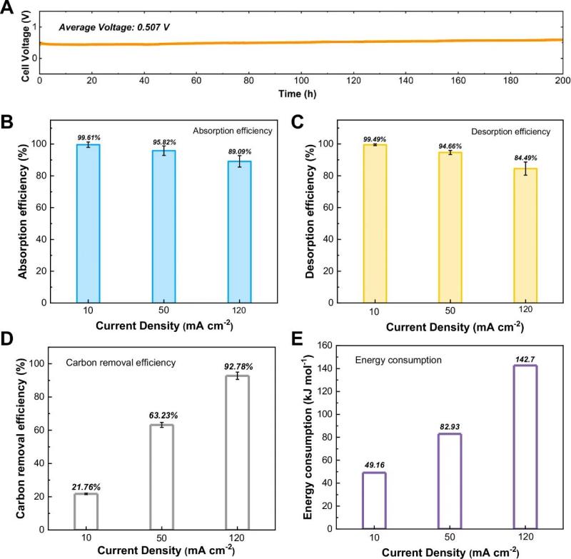 實(shí)驗(yàn)結(jié)果表明,該技術(shù)能夠在200小時(shí)內(nèi)穩(wěn)定運(yùn)行,在10 mA cm-2的電流密度下,電功為 49.16 kJe mol-1。