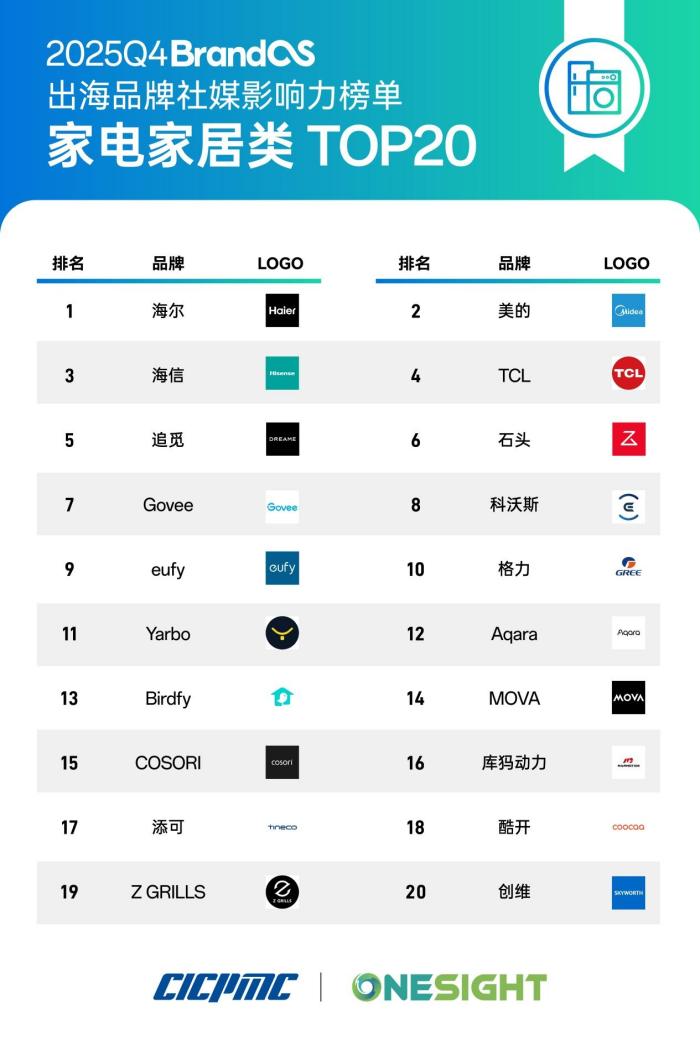 為貫徹落實黨中央、國務(wù)院關(guān)于推動和服務(wù)中國企業(yè)出海的戰(zhàn)略決策,2026年1月20日,經(jīng)中國國際跨國公司促進會監(jiān)制及其戰(zhàn)略合作伙伴中國品牌出海領(lǐng)導(dǎo)者OneSight聯(lián)合發(fā)布的2025Q4《BrandOS出海品牌社媒影響力榜單》正式揭曉。該榜單以“數(shù)據(jù)公開透明性+行業(yè)適配性”為核心原則,提供覆蓋消費電子、汽車、家電家居、新能源、智能制造等8大核心領(lǐng)域的榜單,直觀反映品牌在全球化進程中的階段性成果。