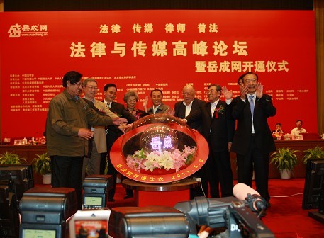 2011年5月8日,由中國(guó)法學(xué)會(huì)名譽(yù)主辦,中國(guó)傳媒大學(xué)、中國(guó)政法大學(xué)、中央人民廣播電臺(tái)、法制日?qǐng)?bào)社、中國(guó)律師雜志社、北京岳成律師事務(wù)所主辦,北京大學(xué)法學(xué)院、清華大學(xué)法學(xué)院、中國(guó)人民大學(xué)法學(xué)院及16家媒體協(xié)辦,43家媒體提供支持的“法律與傳媒高峰論壇暨岳成網(wǎng)開(kāi)通儀式”在北京人民大會(huì)堂隆重舉行。全國(guó)政協(xié)經(jīng)濟(jì)委員會(huì)主任張左己等國(guó)家相關(guān)部門的領(lǐng)導(dǎo)、法學(xué)界和傳媒領(lǐng)域的專家學(xué)者、知名律師、資深記者共計(jì)800余人參加此次活動(dòng)。中國(guó)法學(xué)會(huì)常務(wù)副會(huì)長(zhǎng)劉飏、中國(guó)傳媒大學(xué)黨委書(shū)記李培元、中國(guó)政法大學(xué)校長(zhǎng)黃進(jìn)等領(lǐng)導(dǎo)到會(huì)并致辭。啟動(dòng)儀式上,與會(huì)領(lǐng)導(dǎo)共同啟動(dòng)光球,開(kāi)通了岳成網(wǎng)。論壇開(kāi)幕式由北京岳成律師事務(wù)所岳運(yùn)生主任主持。