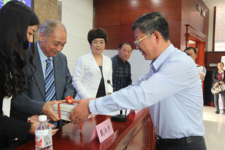 校長陳東軍代表全校師生從戴汝為院士手中接過了贈書