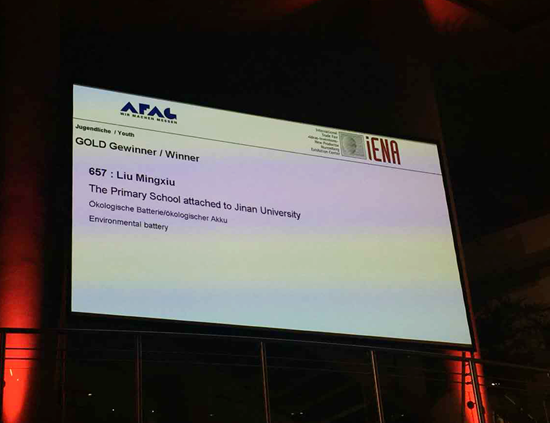 據(jù)悉2017年11月2日到5日期間,第69屆“德國(guó)紐倫堡國(guó)際發(fā)明展”在德國(guó)紐倫堡國(guó)際會(huì)展中心舉行。來自中國(guó)、美國(guó)、俄羅斯、瑞士、西班牙、奧地利以及舉辦地德國(guó)等31個(gè)國(guó)家及地區(qū)的800多項(xiàng)發(fā)明作品參加了展出,其中中國(guó)代表團(tuán)共展出了115件從國(guó)內(nèi)層層選拔出來的優(yōu)秀發(fā)明作品參展。暨南大學(xué)附屬小學(xué)六年級(jí)學(xué)生劉名修的作品“環(huán)保電池”經(jīng)過激烈角逐,最終摘得最高獎(jiǎng)——紐倫堡國(guó)際發(fā)明金獎(jiǎng)。