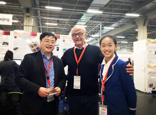 專家(中)和獲金獎(jiǎng)的小發(fā)明人劉名修與她的爸爸劉澤寰博士合影