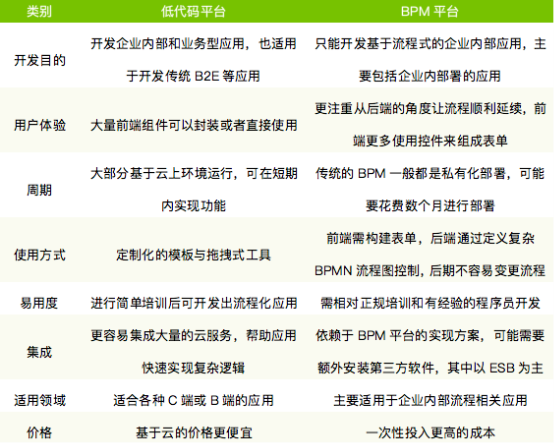 BPM平臺注重流程化開發(fā),目的是通過系統(tǒng)性的改善企業(yè)內(nèi)部的商業(yè)流程來提升組織效率,目前的BPM平臺前端主要是基于表單來實現(xiàn)快速開發(fā),樣式比較固定,后端通過分析BPMN流程圖(業(yè)務(wù)流程建模標注)來完成一步步的流程開發(fā)。