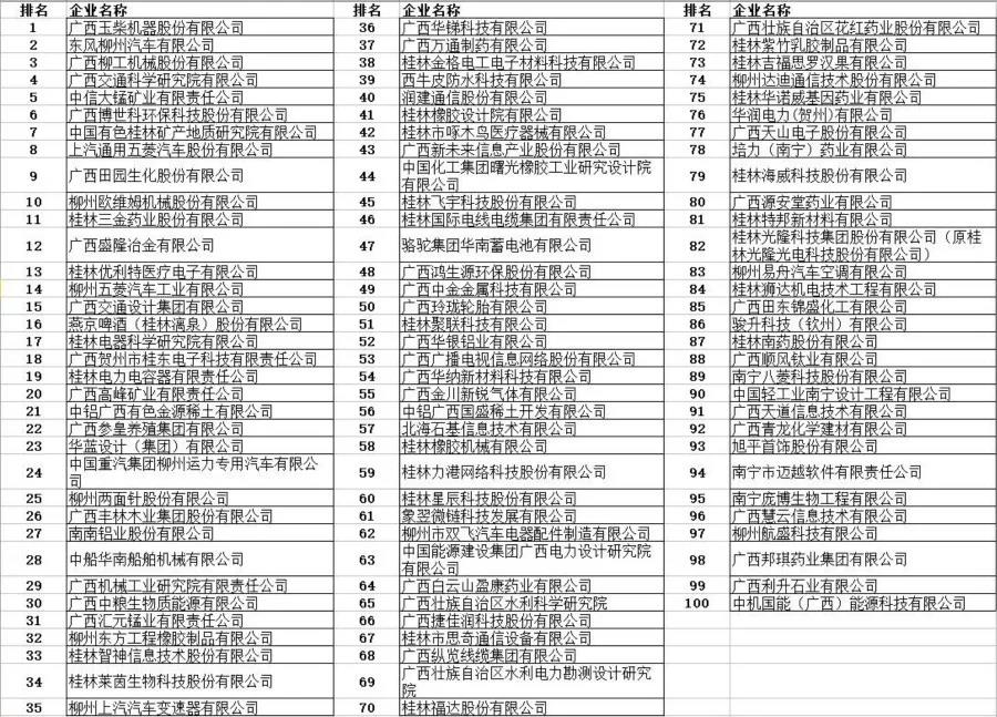 廣西高新技術(shù)企業(yè)百強(qiáng)榜單