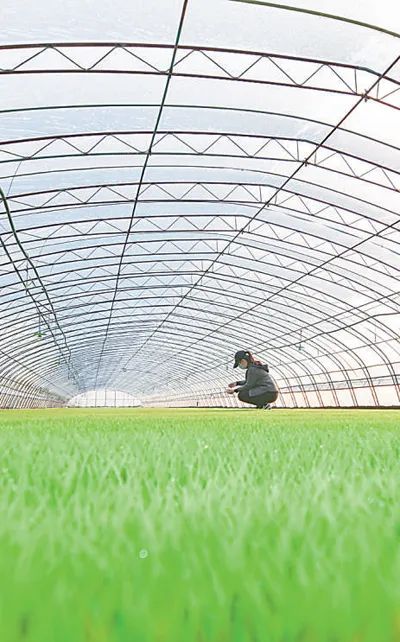 在黑龍江農(nóng)墾紅興隆管理局友誼農(nóng)場(chǎng)第四管理區(qū)一處水稻育秧基地,農(nóng)戶們采用電動(dòng)播種機(jī)、覆土機(jī)實(shí)現(xiàn)機(jī)械化播種。圖為4月18日,農(nóng)戶在查看育秧大棚內(nèi)溫度計(jì)讀數(shù)?! 浺睌z(影像中國(guó))