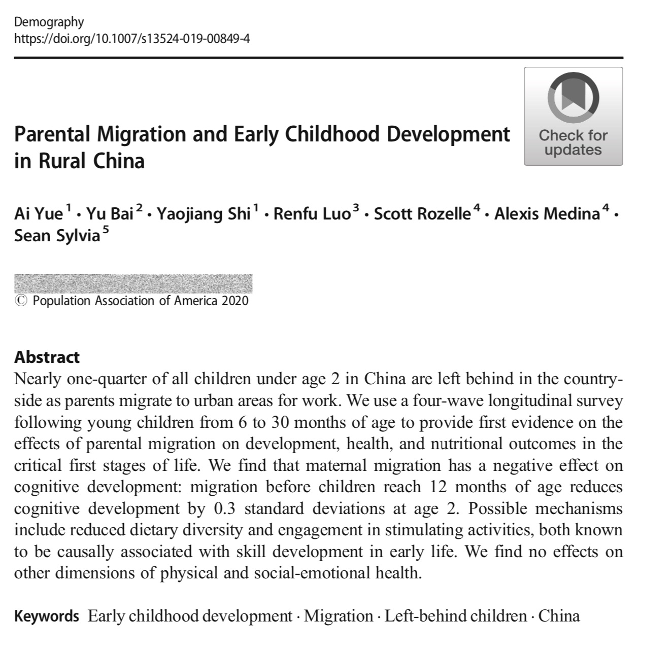北京時間3月13日上午9時,學(xué)術(shù)期刊《人口學(xué)》(Demography)在線發(fā)表了上一項由中美科學(xué)家聯(lián)合完成的研究“ParentalMigrationandEarlyChildhoodDevelopmentinRuralChina”。研