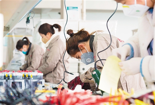 浙江金華武義興巖電器設(shè)備有限公司車間內(nèi),工人們面戴口罩在生產(chǎn)線上忙碌。(資料圖片)位于紹興上虞區(qū)的浙江春暉智能控制股份有限公司生產(chǎn)車間內(nèi),工人正抓緊作業(yè)。(資料圖片)