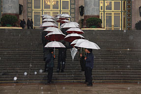大會(huì)堂工作人員細(xì)心為代表撐起遮雪通道 “飛雪迎春到”。3月14日上午,北京大雪飄飄,十一屆全國人大三次會(huì)議在完成各項(xiàng)議程后在人民大會(huì)堂勝利閉幕,為神州大地奏響了春天的序