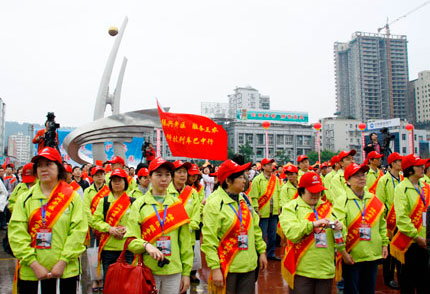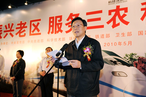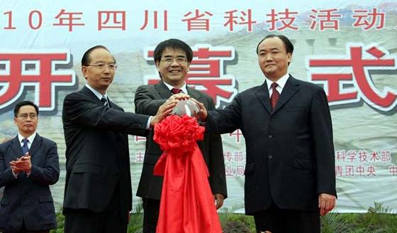 科技部副部長張來武(中)、四川省副省長李成云(左二)、巴中市委書記李仲彬共同啟動(dòng)科技列車巴中行活動(dòng)2010年四川省科技活動(dòng)周暨“振興老區(qū)服務(wù)三農(nóng)科技列車巴中行”活