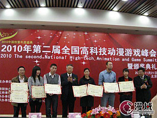 頒獎典禮上獲獎單位的代表們上臺領(lǐng)獎 全國動漫委、中國社科院文化研究中心、中央電視臺央視動畫和吉林動畫學(xué)院11月21日在京召開“2010第二屆全國高科技動漫游戲峰會