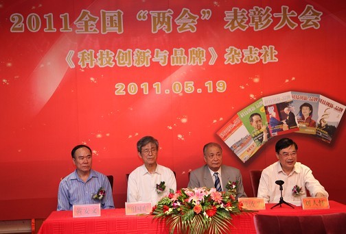 表彰大會現(xiàn)場,從右至左依次為總編輯劉人懷院士、編委會主任戴汝為院士、顧國彪院士和科學時報副總編輯黃安文 ????????5月19日,《科技創(chuàng)新與品牌》雜志社2011年全國兩會采訪