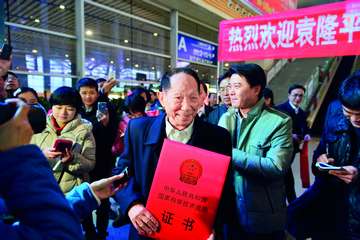 長沙火車南站,袁隆平院士及其團(tuán)隊(duì)載譽(yù)回湘,受到家鄉(xiāng)人民和媒體的熱烈歡迎(長沙日?qǐng)?bào)陳飛攝) 2014年1月11日,剛剛從北京參加完2013年度國家科學(xué)技術(shù)獎(jiǎng)勵(lì)大會(huì)的袁隆平從北京