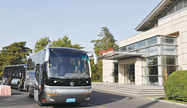 新能源汽車的領(lǐng)跑者—— 東風(fēng)天翼純電動客車文/東風(fēng)旅行車公司 東風(fēng)天翼行駛在釣魚臺國賓館,右則是曾舉辦過朝核六方會談等重要國際活動的主會場“芳菲樓” 我國在