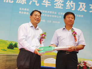 福田歐V客車總經(jīng)理樊文堂(左)向北京公交董事長馮幸福遞交混合動(dòng)力車鑰匙 從2003年9月16日客車事業(yè)部正式成立之日起,福田歐V客車公司就將發(fā)展“節(jié)能環(huán)?!钡男履茉纯?/p>