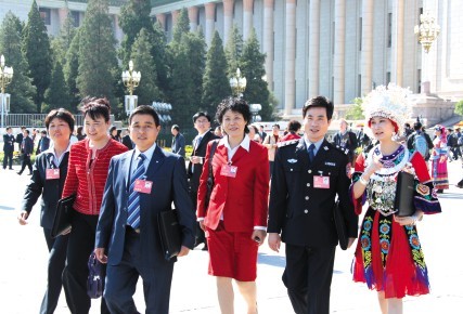 十七大代表在人民大會堂前(右三為張國慶)胡錦濤同志在十七大開幕式報告中指出:社會穩(wěn)定是人民群眾的共同心愿,是改革發(fā)展的重要前提。要健全黨委領(lǐng)導、政府負責、社
