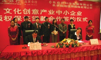 劉建軍副行長代表交通銀行北京分行與北京資和信投資擔保有限公司副總裁王悅殊女士簽署文化創(chuàng)意產(chǎn)業(yè)中小企業(yè)版權(quán)融資合作協(xié)議“2007中國創(chuàng)意產(chǎn)業(yè)年度大獎”頒獎活動