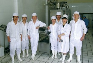 趙征(左三)與研究室?guī)熒谔旖蛑蟹胰闃I(yè)生產(chǎn)線 干酪是高附加值乳制品,發(fā)展干酪加工將有助于我國乳品企業(yè)提高乳品加工的技術(shù)水平和營銷水平。干酪加工是集生物技術(shù)、