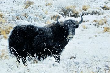風(fēng)雪牦牛 青海省果洛州久治縣有豐富的綠色食品資源和很好的健康傳統(tǒng)。當(dāng)?shù)氐哪撩裼芯渲V語,“牛吃蟲草我吃牛,無病無災(zāi)藥不求”,說的就是那里的牦牛生活在天然草場(chǎng),吃冬蟲