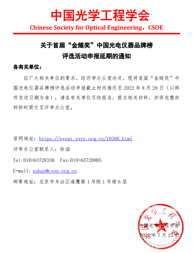 關于首屆“金燧獎”中國光電儀器品牌榜 評選活動申報延期的通知